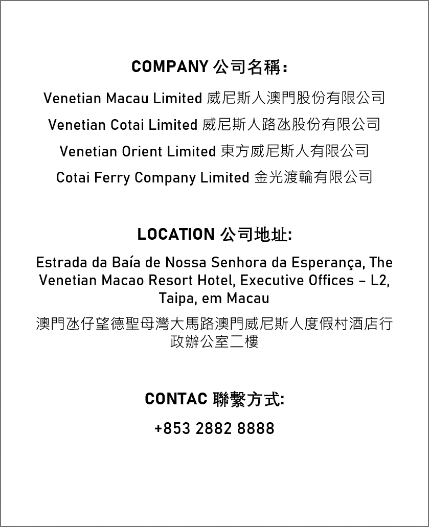 本公司,威尼斯人澳門股份有限公司,包括旗下在澳門的關聯公司和子公司(以下統稱「本公司」),尊重您對私隱的關注並致力於為客人、顧客及遊客(「您」)提供卓越的體驗和服務。本私隱聲明描述了本公司獲取的個人資料的類型、如何使用及保存該個人資料、可能與誰分享該個人資料,以及在我們處理該資料方面您可以如何行使您的權利和選擇權。本私隱聲明尚描述了本公司為所取得的個人資料而採取的安全措施,以及如果您對我們的私隱實務操作上有疑問時可以如何聯繫我們。針對中華人民共和國(為本私隱聲明說明之目的,不包含香港特別行政區、澳門特別行政區和臺灣地區,下稱「中國」)的居民和位於中國境內的個人,請參見附件一獲取更多有關個人資料處理活動的資訊。